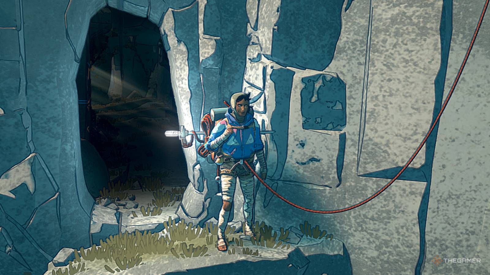 In one place you will find a rare trace of civilization in the mountain. Go through it and find an area filled with yellow crystals. Climb up to the opening find in it glow-in-the-dark gloves.