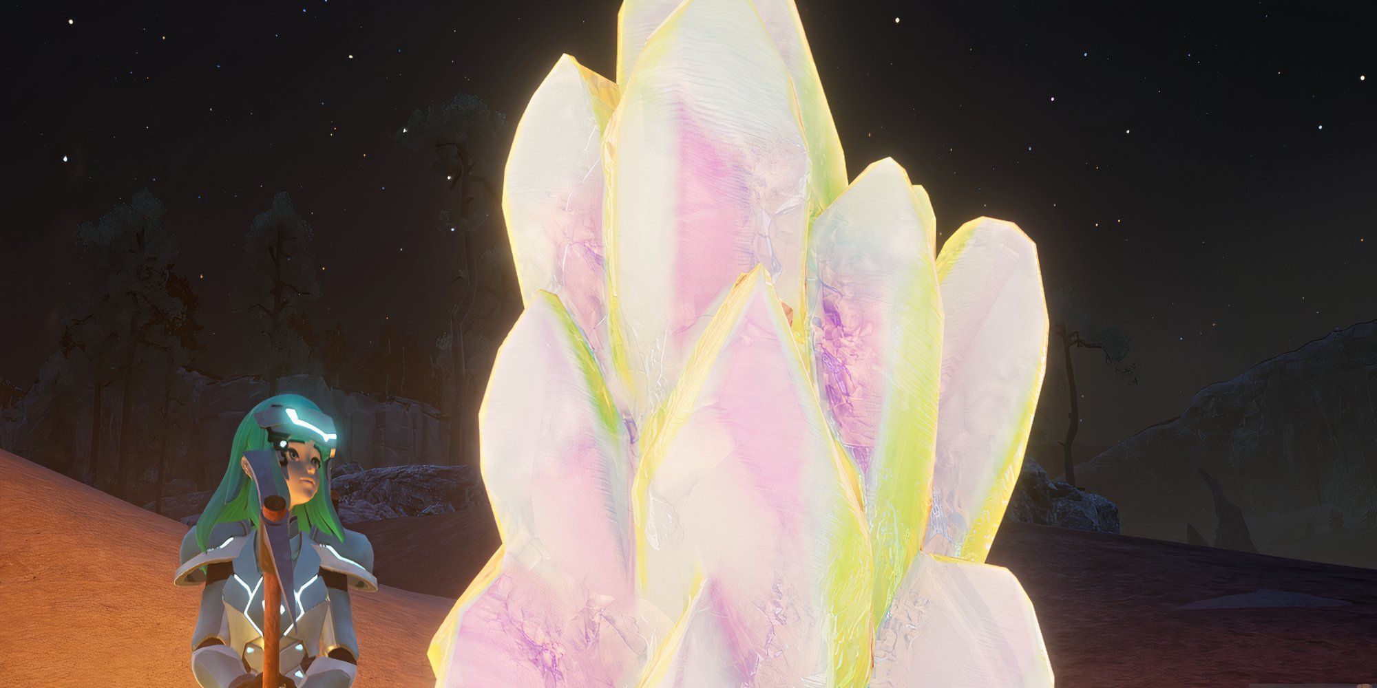 Hexolite Quartz is a holographic colored mineral which is found embedded in large, towering nodes like those pictured above. The nodes themselves are often very easy to spot anywhere, whether you're exploring day or night, even if they're far on the horizon. They are distributed in large numbers throughout the island, often around pastures and beaches. Like other resources in the game, nodes respawn after a certain amount of time, so you never have to worry about running out of places to find them.
