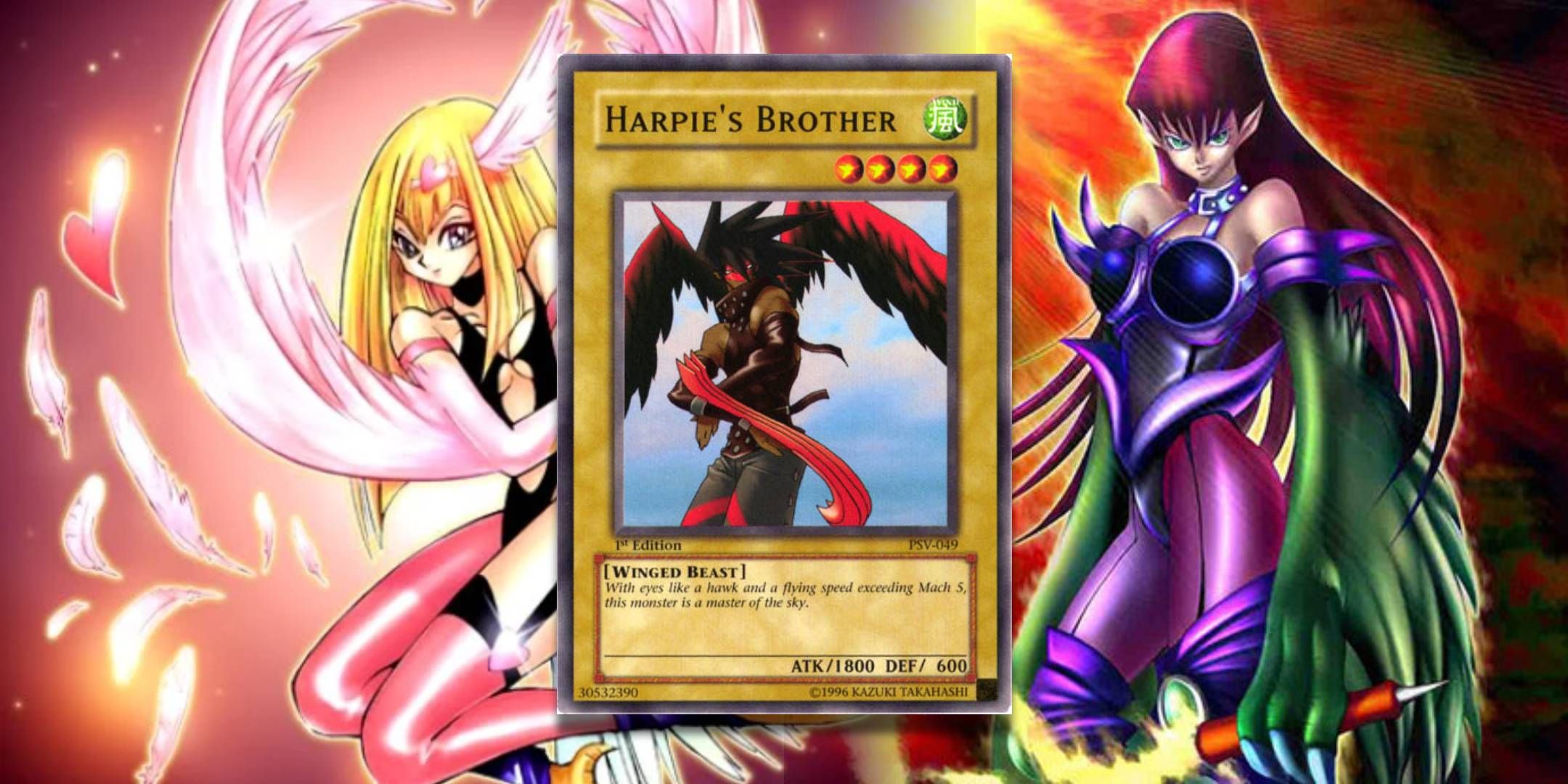 As it turned out, Harpie's brother was not a brother at all, and he was the case of the design changes that had occurred over time. When the localization team responsible for translating the text of the card from Japanese to English saw this card, they had no idea that archetypes and synergistic cards were coming into play. They saw men with characteristics similar to birds and large reddish wings that looked so close to the Harp ladies.